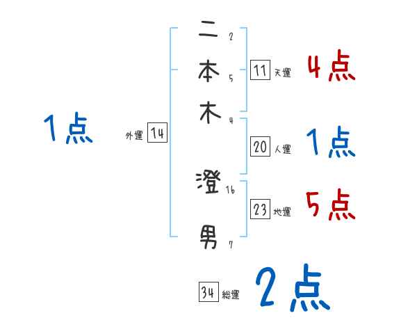 総運![]() | 二本木澄男さんの総運は34画の2つ星!独創性に優れるが、自尊心が強く災難に注意しましょう。 あなたの人生を表す1番重要な運勢です。生涯を通じて影響する総合運となり、主に50歳以降の晩年期に影響を及ぼします。 |