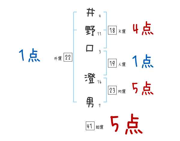 天運![]() | 井野口澄男さんの天運は18画の4つ星!情熱的で剛気。忍耐力があり信頼される。 家系が持つ宿命的な運勢を表します。祖先から受け継いだ苗字ですので自分の力が及びません。家柄を象徴します。 |