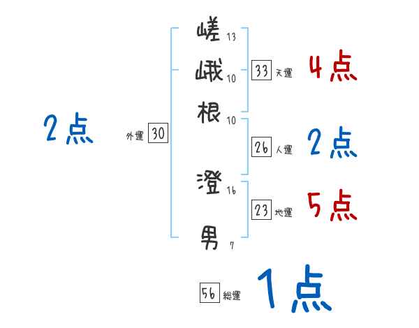 天運![]() | 嵯峨根澄男さんの天運は33画の4つ星!権力志向でプライドが高い。勇気があり運を切り開き成功する。 家系が持つ宿命的な運勢を表します。祖先から受け継いだ苗字ですので自分の力が及びません。家柄を象徴します。 |