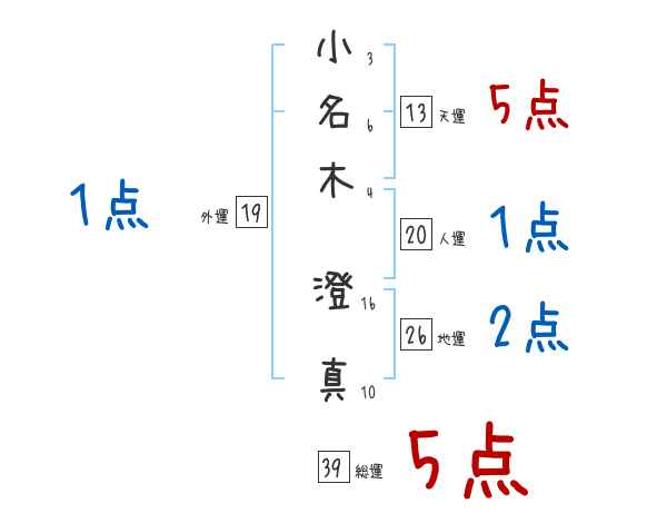 総運![]() | 小名木澄真さんの総運は39画の5つ星!社交性に優れ人望が厚い。人の上に立ち成功する。 あなたの人生を表す1番重要な運勢です。生涯を通じて影響する総合運となり、主に50歳以降の晩年期に影響を及ぼします。 |