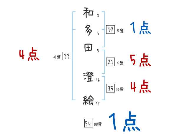 外運![]() | 和多田澄絵さんの外運は33画の4つ星!権力志向でプライドが高い。勇気があり運を切り開き成功する。 生活面を象徴する運勢です。外部から受ける影響力を表し、結婚運、家庭運や職場、環境への順応性を表します。 |