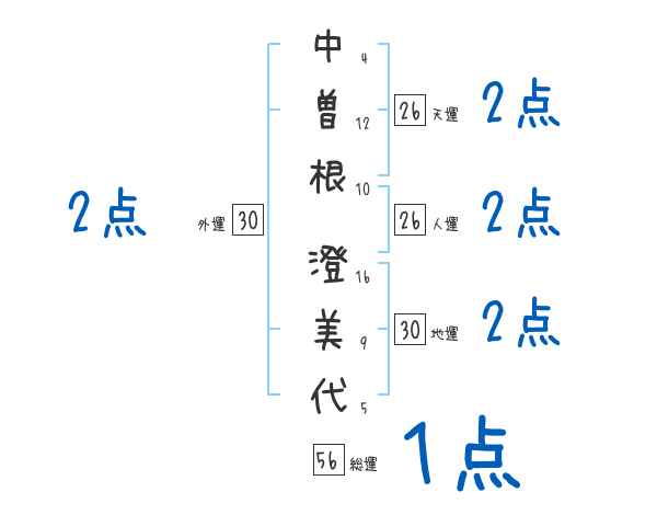 外運![]() | 中曽根澄美代さんの外運は30画の2つ星!浮き沈みの激しさに注意しましょう。 生活面を象徴する運勢です。外部から受ける影響力を表し、結婚運、家庭運や職場、環境への順応性を表します。 |