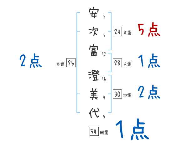 天運![]() | 安次富澄美代さんの天運は24画の5つ星!家庭運が良く順調な人生。金運にも恵まれる。 家系が持つ宿命的な運勢を表します。祖先から受け継いだ苗字ですので自分の力が及びません。家柄を象徴します。 |