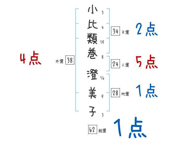 外運![]() | 小比類巻澄美子さんの外運は38画の4つ星!温厚な性格で技術的な才能を発揮する。職人的な仕事に向いている。 生活面を象徴する運勢です。外部から受ける影響力を表し、結婚運、家庭運や職場、環境への順応性を表します。 |