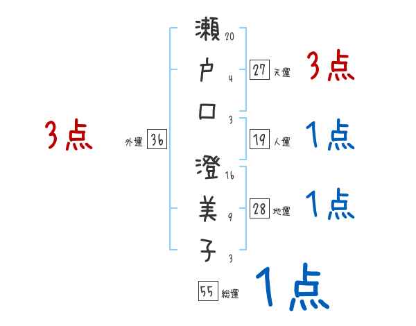 外運![]() | 瀬戸口澄美子さんの外運は36画の3つ星!先見性が豊かです。多少神経質で苦労することも。 生活面を象徴する運勢です。外部から受ける影響力を表し、結婚運、家庭運や職場、環境への順応性を表します。 |