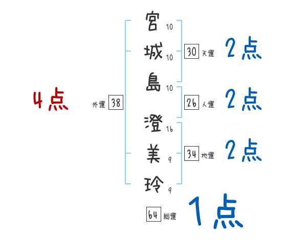 外運![]() | 宮城島澄美玲さんの外運は38画の4つ星!温厚な性格で技術的な才能を発揮する。職人的な仕事に向いている。 生活面を象徴する運勢です。外部から受ける影響力を表し、結婚運、家庭運や職場、環境への順応性を表します。 |
