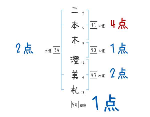 外運![]() | 二本木澄美礼さんの外運は34画の2つ星!独創性に優れるが、自尊心が強く災難に注意しましょう。 生活面を象徴する運勢です。外部から受ける影響力を表し、結婚運、家庭運や職場、環境への順応性を表します。 |