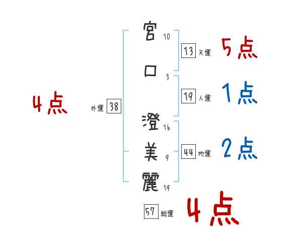 外運![]() | 宮口澄美麗さんの外運は38画の4つ星!温厚な性格で技術的な才能を発揮する。職人的な仕事に向いている。 生活面を象徴する運勢です。外部から受ける影響力を表し、結婚運、家庭運や職場、環境への順応性を表します。 |