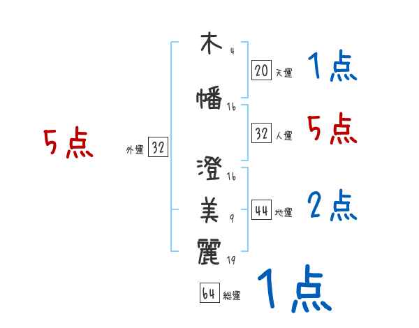 外運![]() | 木幡澄美麗さんの外運は32画の5つ星!柔軟性があり成功する。チャンスが多く金運が良い。 生活面を象徴する運勢です。外部から受ける影響力を表し、結婚運、家庭運や職場、環境への順応性を表します。 |