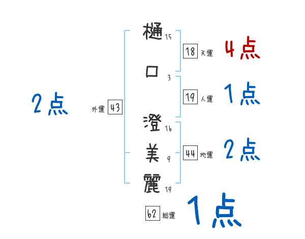 地運![]() | 樋口澄美麗さんの地運は44画の2つ星!誠実で慎重な性格。物事を考えすぎないように注意しましょう。 個性を表す基礎的な運勢です。性格形成や対人関係、行動力など家庭環境に影響されます。主に誕生してから20歳くらいまでの若年期の運勢を表します。 |