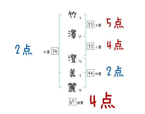 天運![]() | 竹澤澄美麗さんの天運は23画の5つ星!想像力に優れ活力がある。一代で成功し名誉を手に入れる。 家系が持つ宿命的な運勢を表します。祖先から受け継いだ苗字ですので自分の力が及びません。家柄を象徴します。 |