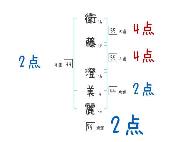 天運![]() | 衛藤澄美麗さんの天運は35画の4つ星!温厚な性格で感受性が高い。穏和な性格で人望が厚い。 家系が持つ宿命的な運勢を表します。祖先から受け継いだ苗字ですので自分の力が及びません。家柄を象徴します。 |