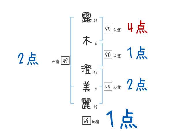 天運![]() | 露木澄美麗さんの天運は25画の4つ星!個性があり才能があふれる。強運の持ち主で発展する。 家系が持つ宿命的な運勢を表します。祖先から受け継いだ苗字ですので自分の力が及びません。家柄を象徴します。 |