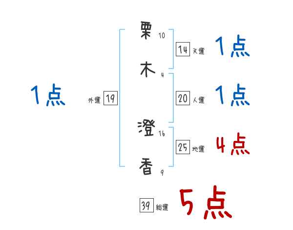 天運![]() | 栗木澄香さんの天運は14画の1つ星!人に対して優しいがストレスを溜め込みがち。人間関係のトラブルを避けるよう気をつけましょう。 家系が持つ宿命的な運勢を表します。祖先から受け継いだ苗字ですので自分の力が及びません。家柄を象徴します。 |