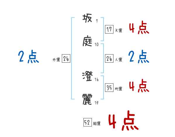外運![]() | 坂庭澄麗さんの外運は26画の2つ星!波瀾万丈かも。信頼できる人を大事にしましょう。 生活面を象徴する運勢です。外部から受ける影響力を表し、結婚運、家庭運や職場、環境への順応性を表します。 |