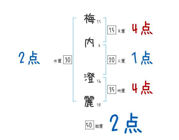外運![]() | 梅内澄麗さんの外運は30画の2つ星!浮き沈みの激しさに注意しましょう。 生活面を象徴する運勢です。外部から受ける影響力を表し、結婚運、家庭運や職場、環境への順応性を表します。 |