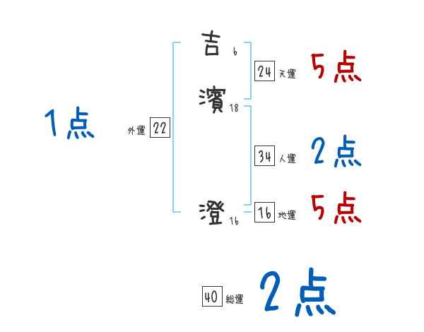 外運![]() | 吉濱澄さんの外運は22画の1つ星!努力することが苦手ないっぽう手先が器用。芸術性にも優れる。 生活面を象徴する運勢です。外部から受ける影響力を表し、結婚運、家庭運や職場、環境への順応性を表します。 |