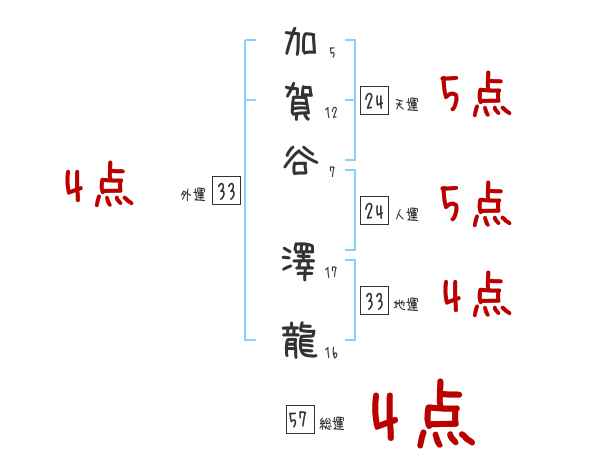 天運![]() | 加賀谷澤龍さんの天運は24画の5つ星!家庭運が良く順調な人生。金運にも恵まれる。 家系が持つ宿命的な運勢を表します。祖先から受け継いだ苗字ですので自分の力が及びません。家柄を象徴します。 |