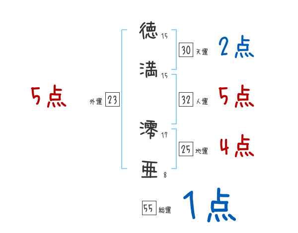 天運![]() | 徳満澪亜さんの天運は30画の2つ星!浮き沈みの激しさに注意しましょう。 家系が持つ宿命的な運勢を表します。祖先から受け継いだ苗字ですので自分の力が及びません。家柄を象徴します。 |