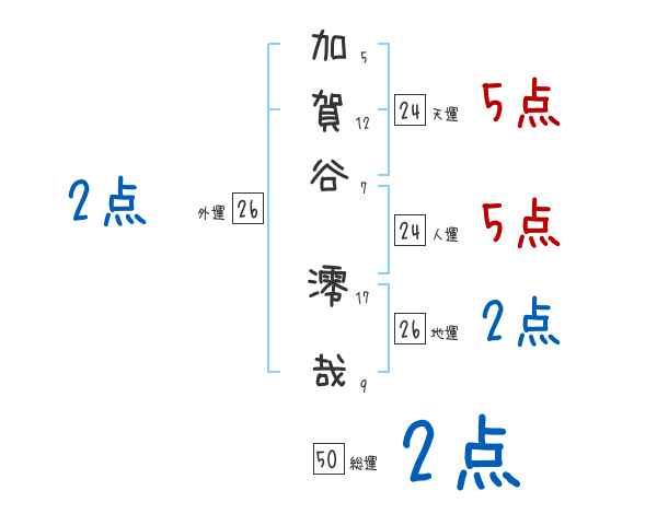 天運![]() | 加賀谷澪哉さんの天運は24画の5つ星!家庭運が良く順調な人生。金運にも恵まれる。 家系が持つ宿命的な運勢を表します。祖先から受け継いだ苗字ですので自分の力が及びません。家柄を象徴します。 |