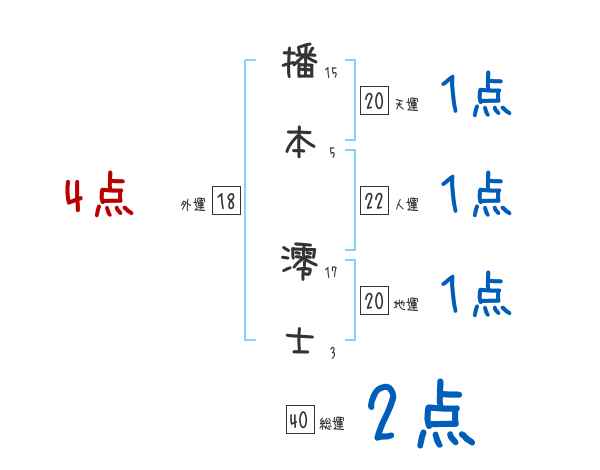 外運![]() | 播本澪士さんの外運は18画の4つ星!情熱的で剛気。忍耐力があり信頼される。 生活面を象徴する運勢です。外部から受ける影響力を表し、結婚運、家庭運や職場、環境への順応性を表します。 |