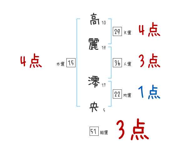 外運![]() | 高麗澪央さんの外運は15画の4つ星!人徳があり出世する。順調に物事を進め円満な人生。 生活面を象徴する運勢です。外部から受ける影響力を表し、結婚運、家庭運や職場、環境への順応性を表します。 |