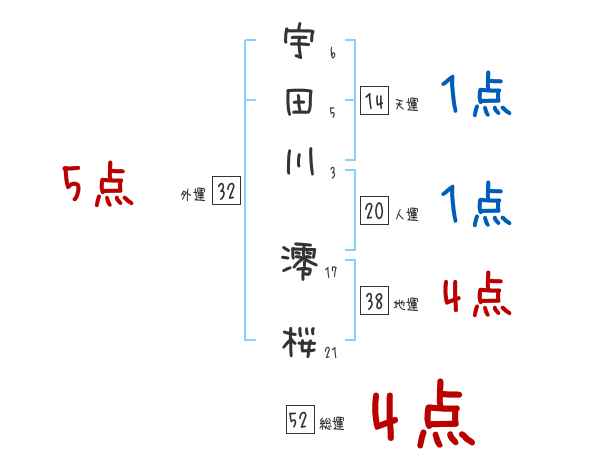 外運![]() | 宇田川澪桜さんの外運は32画の5つ星!柔軟性があり成功する。チャンスが多く金運が良い。 生活面を象徴する運勢です。外部から受ける影響力を表し、結婚運、家庭運や職場、環境への順応性を表します。 |