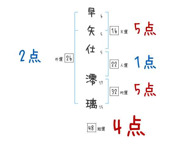外運![]() | 早矢仕澪璃さんの外運は26画の2つ星!波瀾万丈かも。信頼できる人を大事にしましょう。 生活面を象徴する運勢です。外部から受ける影響力を表し、結婚運、家庭運や職場、環境への順応性を表します。 |