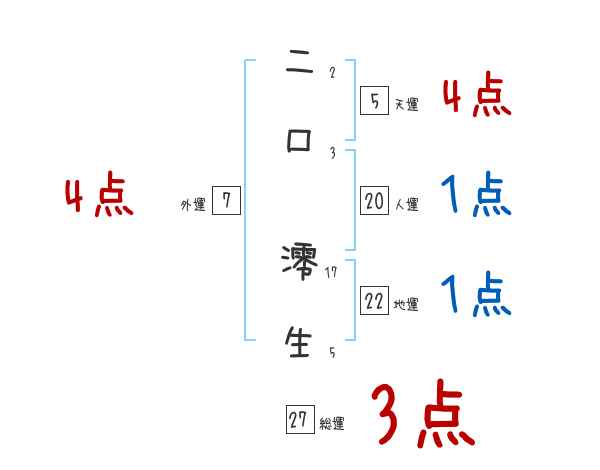 天運![]() | 二口澪生さんの天運は5画の4つ星!健康で安泰。協調性に優れ、財産に恵まれる。 家系が持つ宿命的な運勢を表します。祖先から受け継いだ苗字ですので自分の力が及びません。家柄を象徴します。 |