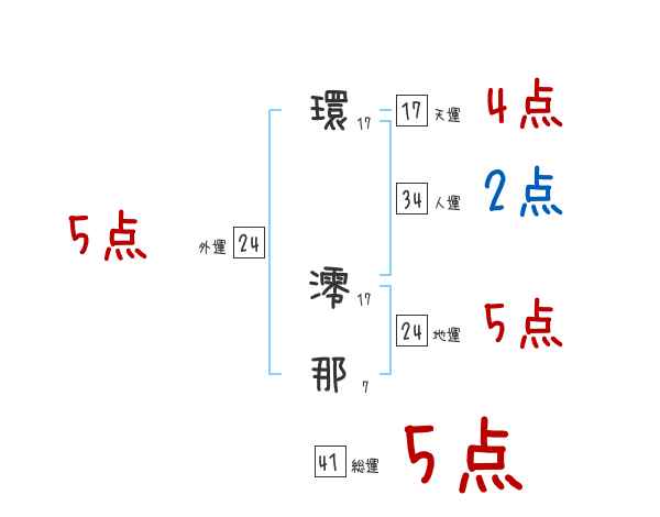 外運![]() | 環澪那さんの外運は24画の5つ星!家庭運が良く順調な人生。金運にも恵まれる。 生活面を象徴する運勢です。外部から受ける影響力を表し、結婚運、家庭運や職場、環境への順応性を表します。 |