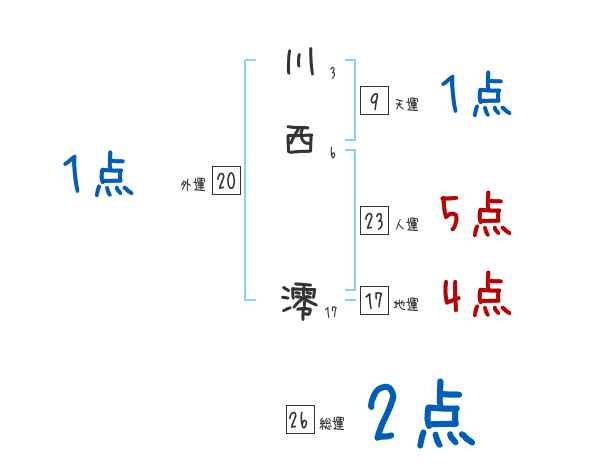 総運![]() | 川西澪さんの総運は26画の2つ星!波瀾万丈かも。信頼できる人を大事にしましょう。 あなたの人生を表す1番重要な運勢です。生涯を通じて影響する総合運となり、主に50歳以降の晩年期に影響を及ぼします。 |