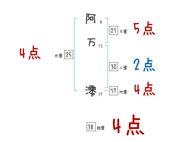 天運![]() | 阿万澪さんの天運は21画の5つ星!統率力がある。独立し成功する。名誉を手に入れる。 家系が持つ宿命的な運勢を表します。祖先から受け継いだ苗字ですので自分の力が及びません。家柄を象徴します。 |