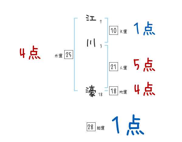 総運![]() | 江川濠さんの総運は28画の1つ星!家庭環境に注意。スポーツで活躍できる能力があるかも。 あなたの人生を表す1番重要な運勢です。生涯を通じて影響する総合運となり、主に50歳以降の晩年期に影響を及ぼします。 |