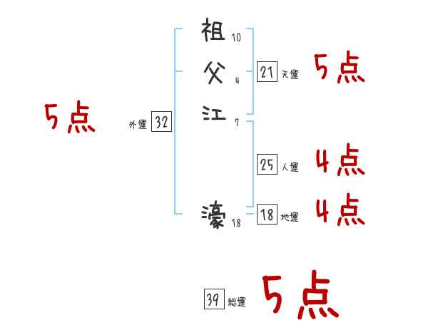 総運![]() | 祖父江濠さんの総運は39画の5つ星!社交性に優れ人望が厚い。人の上に立ち成功する。 あなたの人生を表す1番重要な運勢です。生涯を通じて影響する総合運となり、主に50歳以降の晩年期に影響を及ぼします。 |