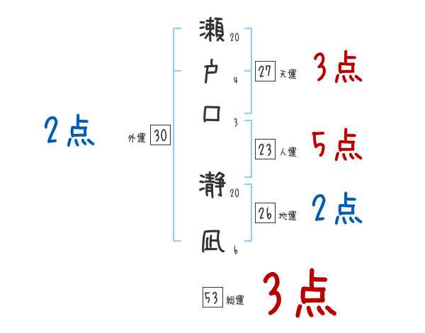 天運![]() | 瀬戸口瀞凪さんの天運は27画の3つ星!頭脳明晰だが強情で摩擦が多い傾向。孤立に注意。 家系が持つ宿命的な運勢を表します。祖先から受け継いだ苗字ですので自分の力が及びません。家柄を象徴します。 |