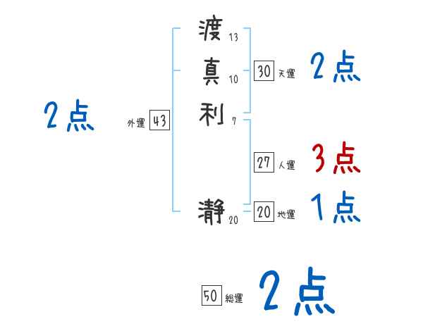 天運![]() | 渡真利瀞さんの天運は30画の2つ星!浮き沈みの激しさに注意しましょう。 家系が持つ宿命的な運勢を表します。祖先から受け継いだ苗字ですので自分の力が及びません。家柄を象徴します。 |