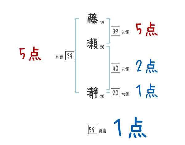 外運![]() | 藤瀬瀞さんの外運は39画の5つ星!社交性に優れ人望が厚い。人の上に立ち成功する。 生活面を象徴する運勢です。外部から受ける影響力を表し、結婚運、家庭運や職場、環境への順応性を表します。 |