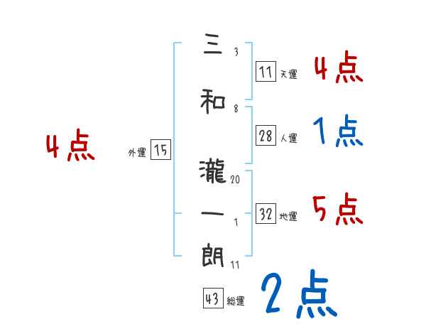 天運![]() | 三和瀧一朗さんの天運は11画の4つ星!着実に富や地位を得る幸運な人生。 家系が持つ宿命的な運勢を表します。祖先から受け継いだ苗字ですので自分の力が及びません。家柄を象徴します。 |