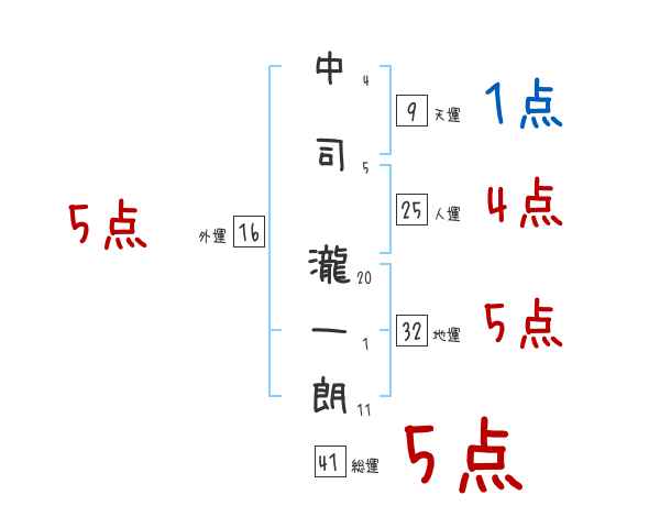 外運![]() | 中司瀧一朗さんの外運は16画の5つ星!人望が厚く大きく発展する。逆転成功が見える。 生活面を象徴する運勢です。外部から受ける影響力を表し、結婚運、家庭運や職場、環境への順応性を表します。 |