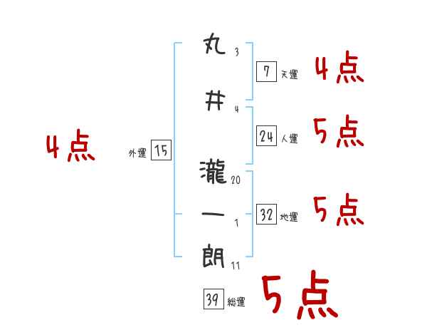 総運![]() | 丸井瀧一朗さんの総運は39画の5つ星!社交性に優れ人望が厚い。人の上に立ち成功する。 あなたの人生を表す1番重要な運勢です。生涯を通じて影響する総合運となり、主に50歳以降の晩年期に影響を及ぼします。 |
