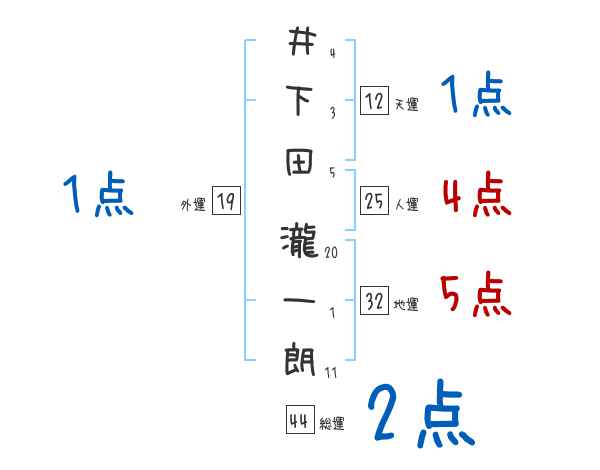 地運![]() | 井下田瀧一朗さんの地運は32画の5つ星!柔軟性があり成功する。チャンスが多く金運が良い。 個性を表す基礎的な運勢です。性格形成や対人関係、行動力など家庭環境に影響されます。主に誕生してから20歳くらいまでの若年期の運勢を表します。 |