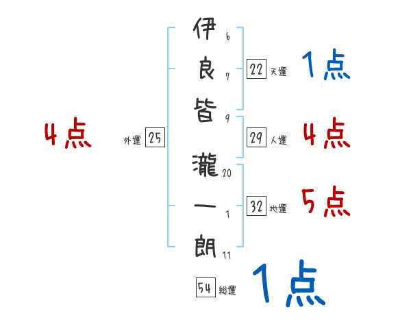 総運![]() | 伊良皆瀧一朗さんの総運は54画の1つ星!トラブルが多いかも。周りをよく見て協調して過ごしましょう。 あなたの人生を表す1番重要な運勢です。生涯を通じて影響する総合運となり、主に50歳以降の晩年期に影響を及ぼします。 |