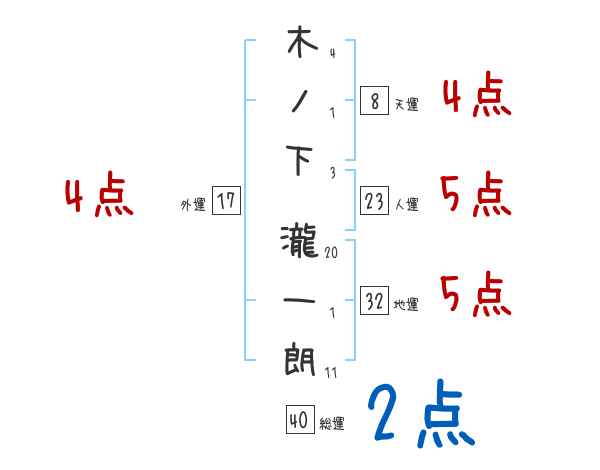 外運![]() | 木ノ下瀧一朗さんの外運は17画の4つ星!積極的な行動力。地位を気づき財産を手に入れる。純粋な心と直感力。 生活面を象徴する運勢です。外部から受ける影響力を表し、結婚運、家庭運や職場、環境への順応性を表します。 |