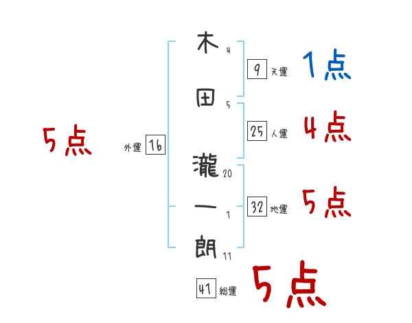 外運![]() | 木田瀧一朗さんの外運は16画の5つ星!人望が厚く大きく発展する。逆転成功が見える。 生活面を象徴する運勢です。外部から受ける影響力を表し、結婚運、家庭運や職場、環境への順応性を表します。 |