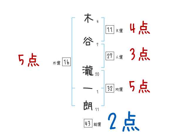 地運![]()  | 木谷瀧一朗さんの地運は32画の5つ星!柔軟性があり成功する。チャンスが多く金運が良い。 個性を表す基礎的な運勢です。性格形成や対人関係、行動力など家庭環境に影響されます。主に誕生してから20歳くらいまでの若年期の運勢を表します。 |