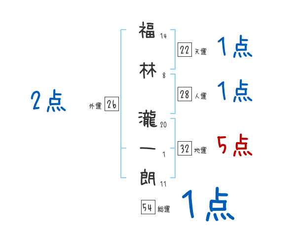 天運![]() | 福林瀧一朗さんの天運は22画の1つ星!努力することが苦手ないっぽう手先が器用。芸術性にも優れる。 家系が持つ宿命的な運勢を表します。祖先から受け継いだ苗字ですので自分の力が及びません。家柄を象徴します。 |