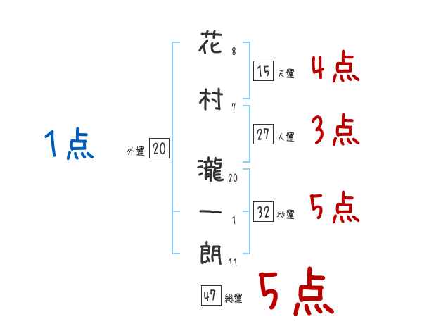 地運![]() | 花村瀧一朗さんの地運は32画の5つ星!柔軟性があり成功する。チャンスが多く金運が良い。 個性を表す基礎的な運勢です。性格形成や対人関係、行動力など家庭環境に影響されます。主に誕生してから20歳くらいまでの若年期の運勢を表します。 |