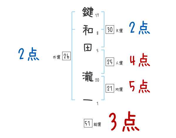 天運![]() | 鍵和田瀧一さんの天運は30画の2つ星!浮き沈みの激しさに注意しましょう。 家系が持つ宿命的な運勢を表します。祖先から受け継いだ苗字ですので自分の力が及びません。家柄を象徴します。 |