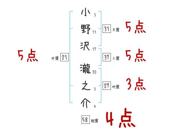 外運![]() | 小野沢瀧之介さんの外運は21画の5つ星!統率力がある。独立し成功する。名誉を手に入れる。 生活面を象徴する運勢です。外部から受ける影響力を表し、結婚運、家庭運や職場、環境への順応性を表します。 |
