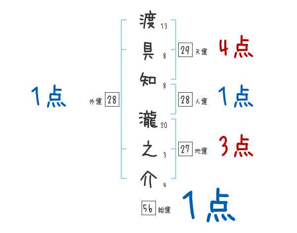 人運![]() | 渡具知瀧之介さんの人運は28画の1つ星!家庭環境に注意。スポーツで活躍できる能力があるかも。 性格や才能などを表す2番目に重要な運勢です。人間関係や協調性、社会的な成功に影響します。主に20歳から50歳ぐらいまでの中年期の運勢を表します。 |